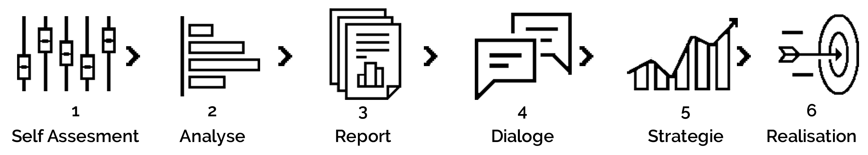 Beim „Self Assesment“ (1) werden die Daten und Dokumente zu verschiedenen Bereichen durch die Akteure bereitgestellt, die einer fundierten Analyse (2) unterzogen werden. Damit wird ein klar strukturierter Bericht (3) erstellt mit dem dann der Grundstein für Dialoge (4) gelegt und ein strategischer Zielbildungsprozess (5) ermöglicht wird. Die sechsstufige Prozesskette wird schließlich mit einem Programm und der zielorientierten Umsetzung dezidierter Maßnahmen abgeschlossen. Um die Wirkung der umgesetzten Maßnahmen zu erfassen wird schließlich mit dem ersten Schritt erneut begonnen